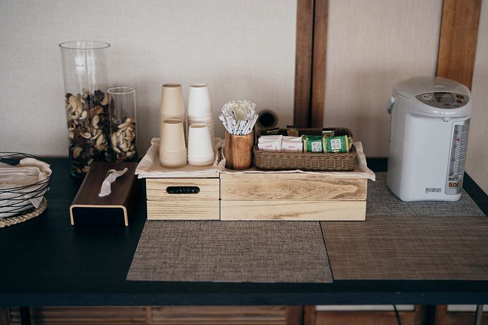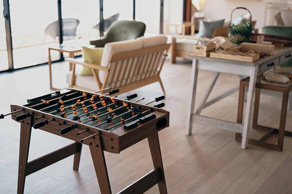 眼前に常磐灘の水平線を望むウッドデッキにデッキチェア。ゆったりとしたお寛ぎをお約束する大型ソファとリラックスチェア。ワーケーションにもぴったりのリラックス・ワークテーブル、コンセント各種、Free Wi-Fi。各種ゲーム、ダーツ、趣味の雑誌や絵本などもご用意。無料でお愉しみいただける紅茶、デトックスウォーター等もご準備いたしました。